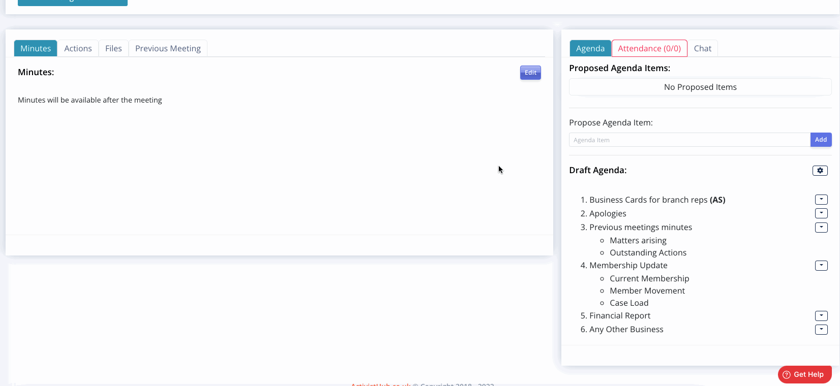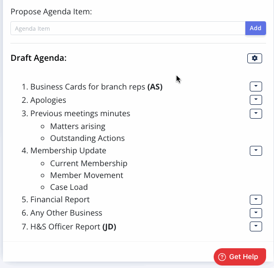 If your branch has default agenda items set up within the ActivistHub these can all be loaded by clicking “Load Default Agenda Items” from the same menu.