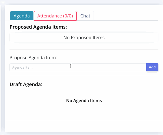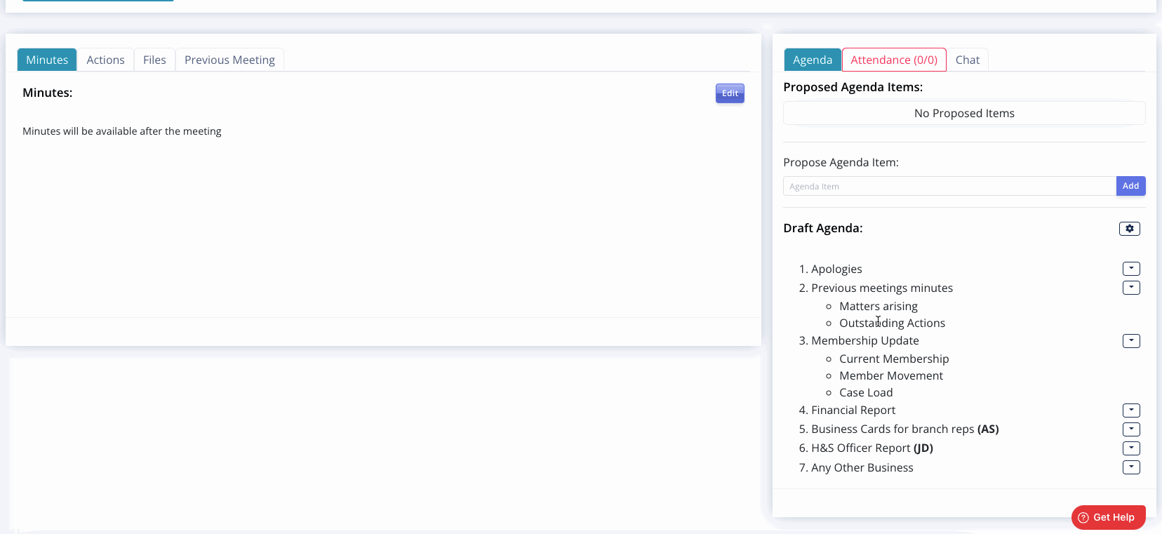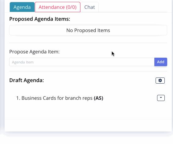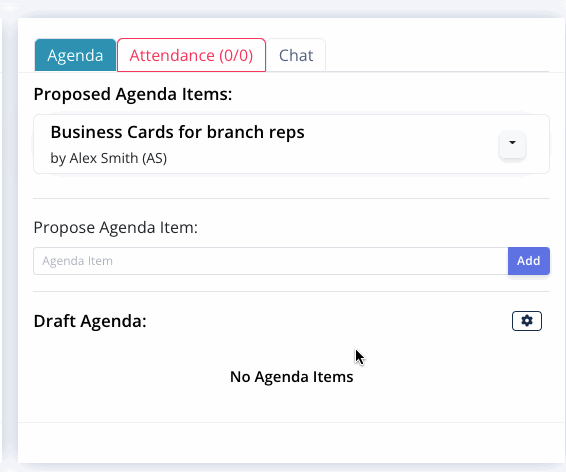 Now we've loaded the meeting we can see the agenda tab on the right side of the screen, as the meeting hasn't taken place yet each user has the option to propose an agenda item by typing in the agenda item description and clicking add. Here we see Alex adding “Business Cards for branch reps”, once added the proposed item is visible to all users.