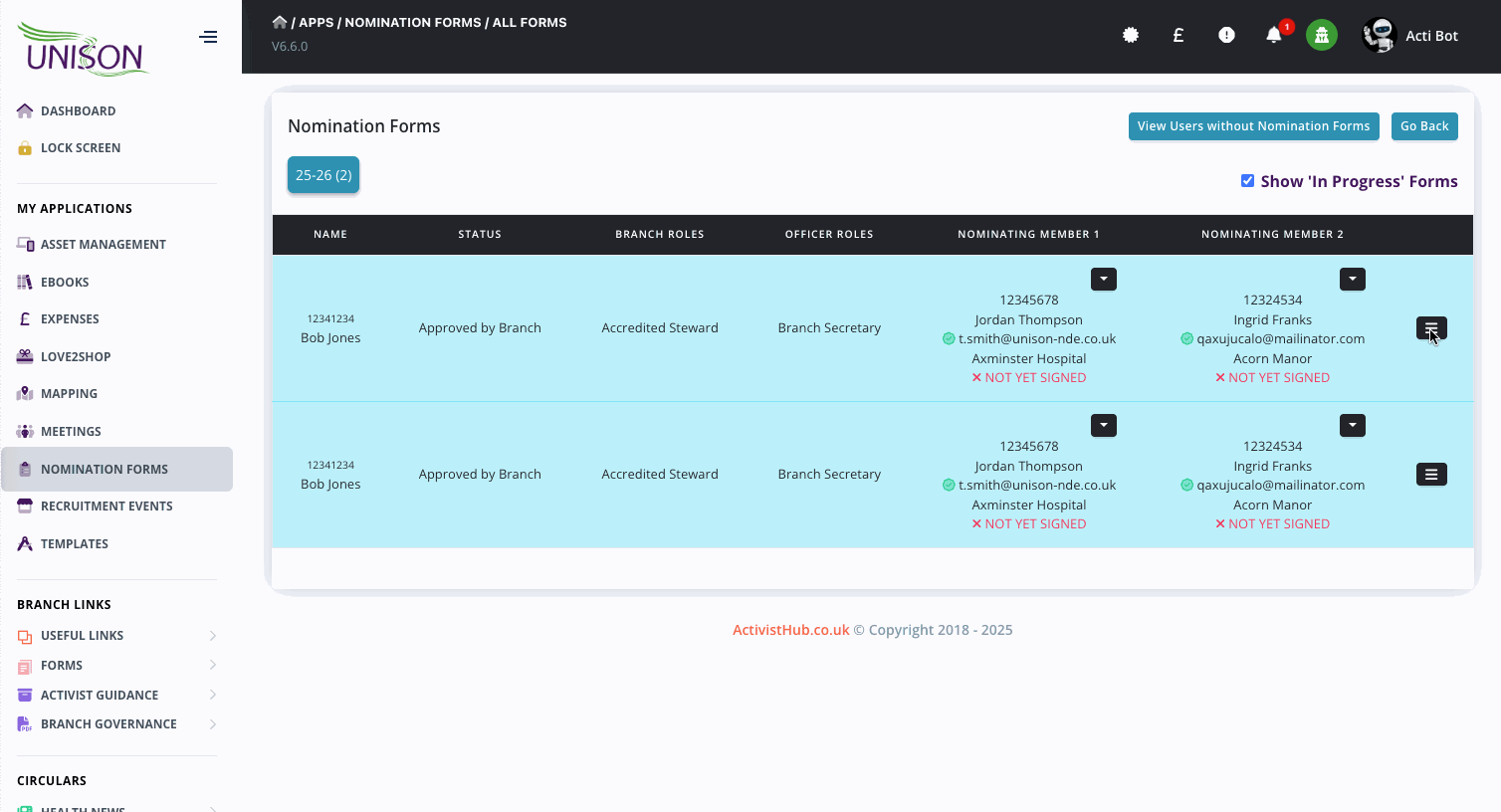 Identify the correct row in the results, this option will only be available on submitted forms, not yet signed by both members. Click on the options button on the far right of the row represented by 3 horizontal lines. In the drop-down menu select ‘Resend Email to Proposers’.